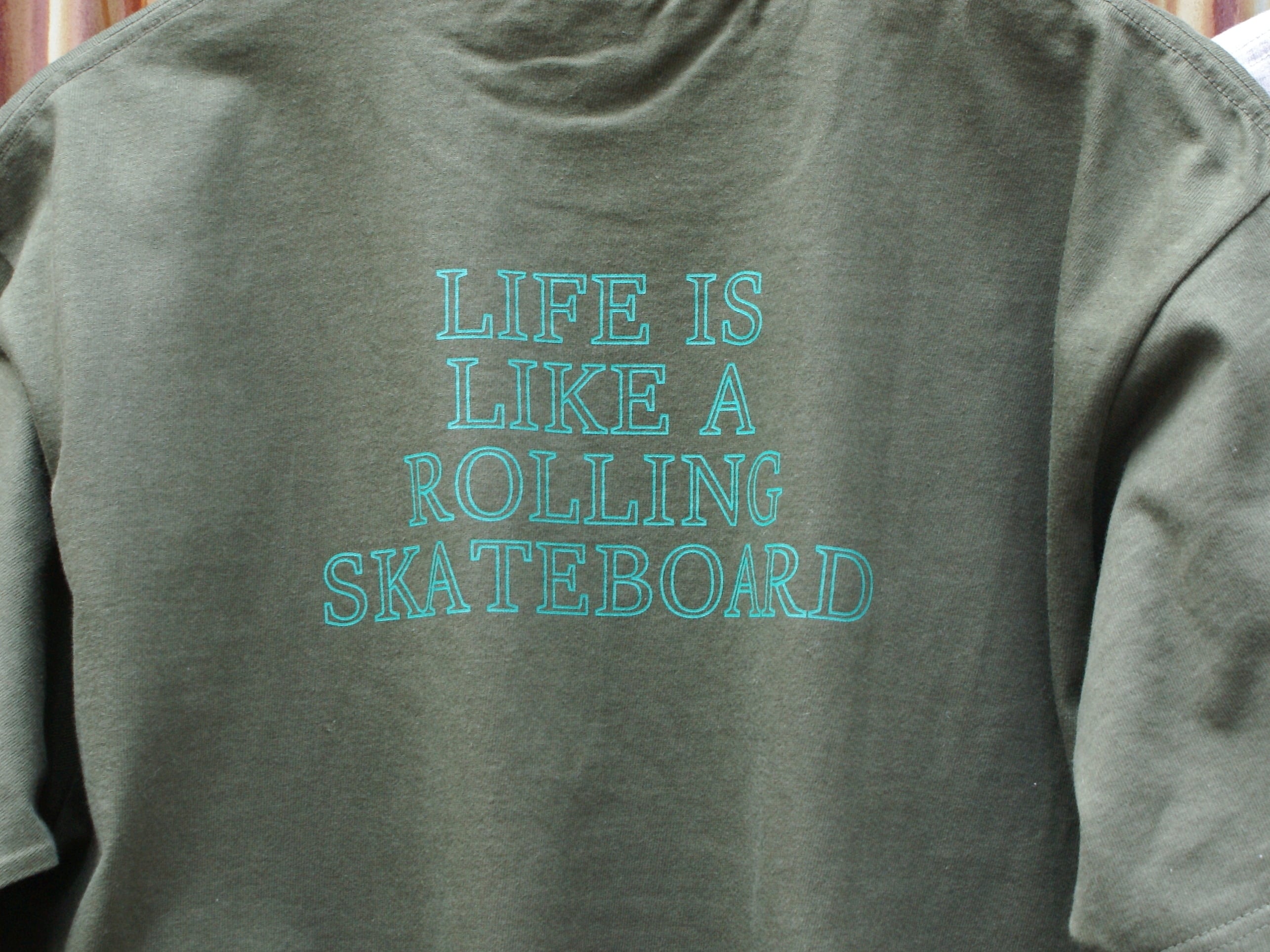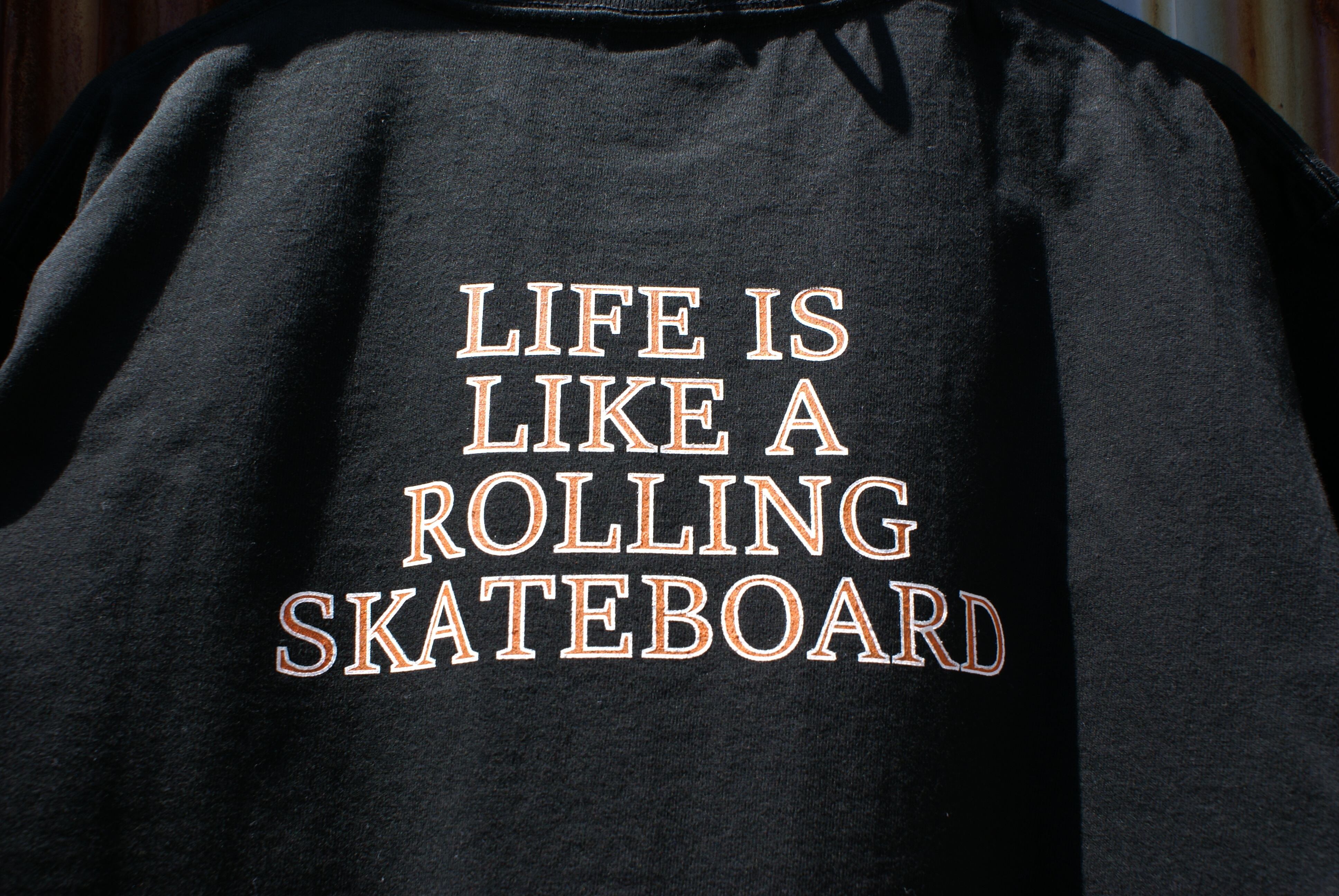背中に2023SSシーズンのテーマのLIFE IS LIKE A ROLLING SKATEBOARDロゴを、左胸にはブランドロゴを配置しております。
